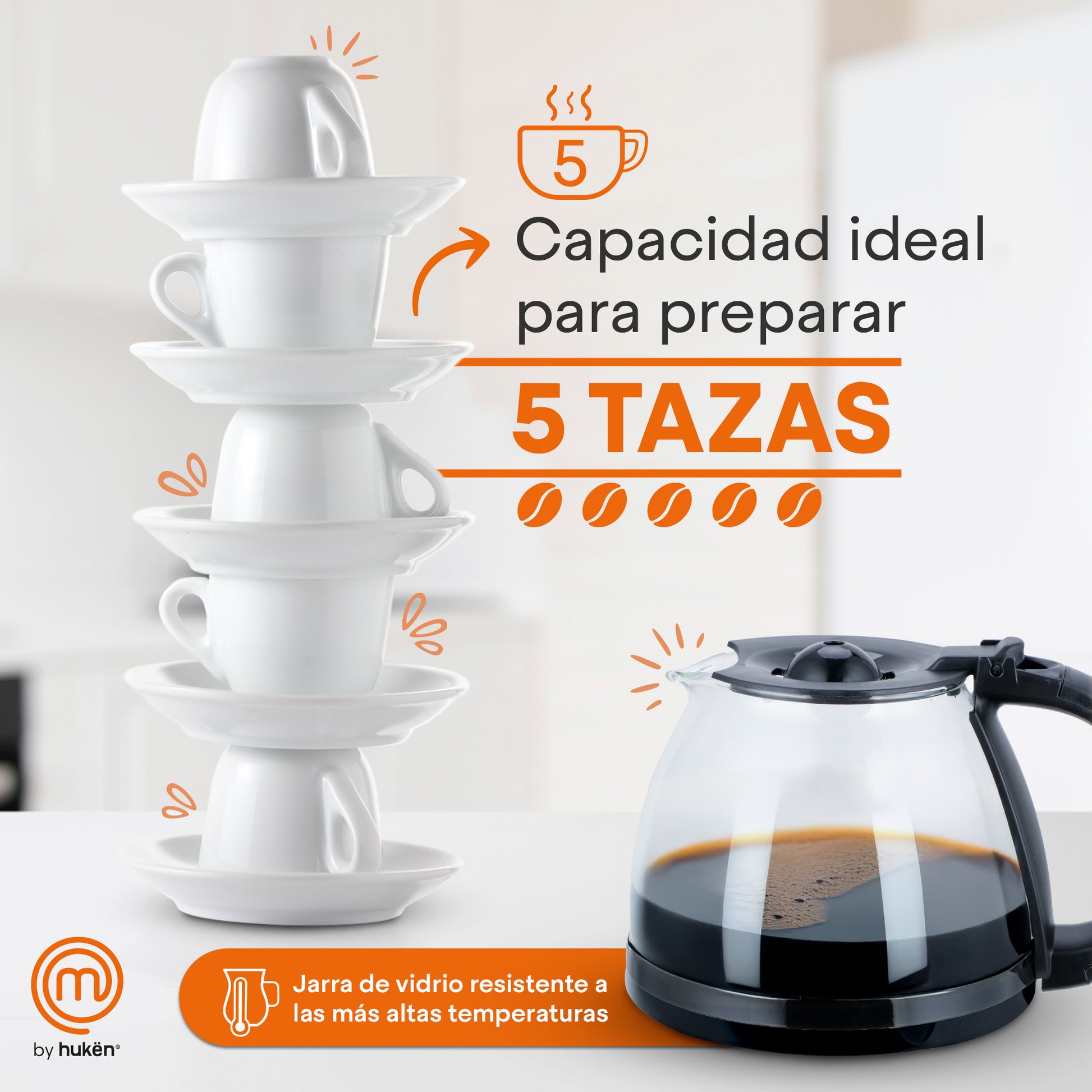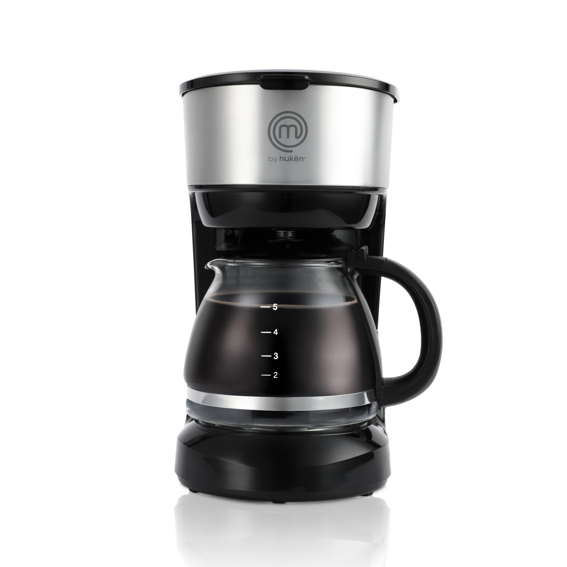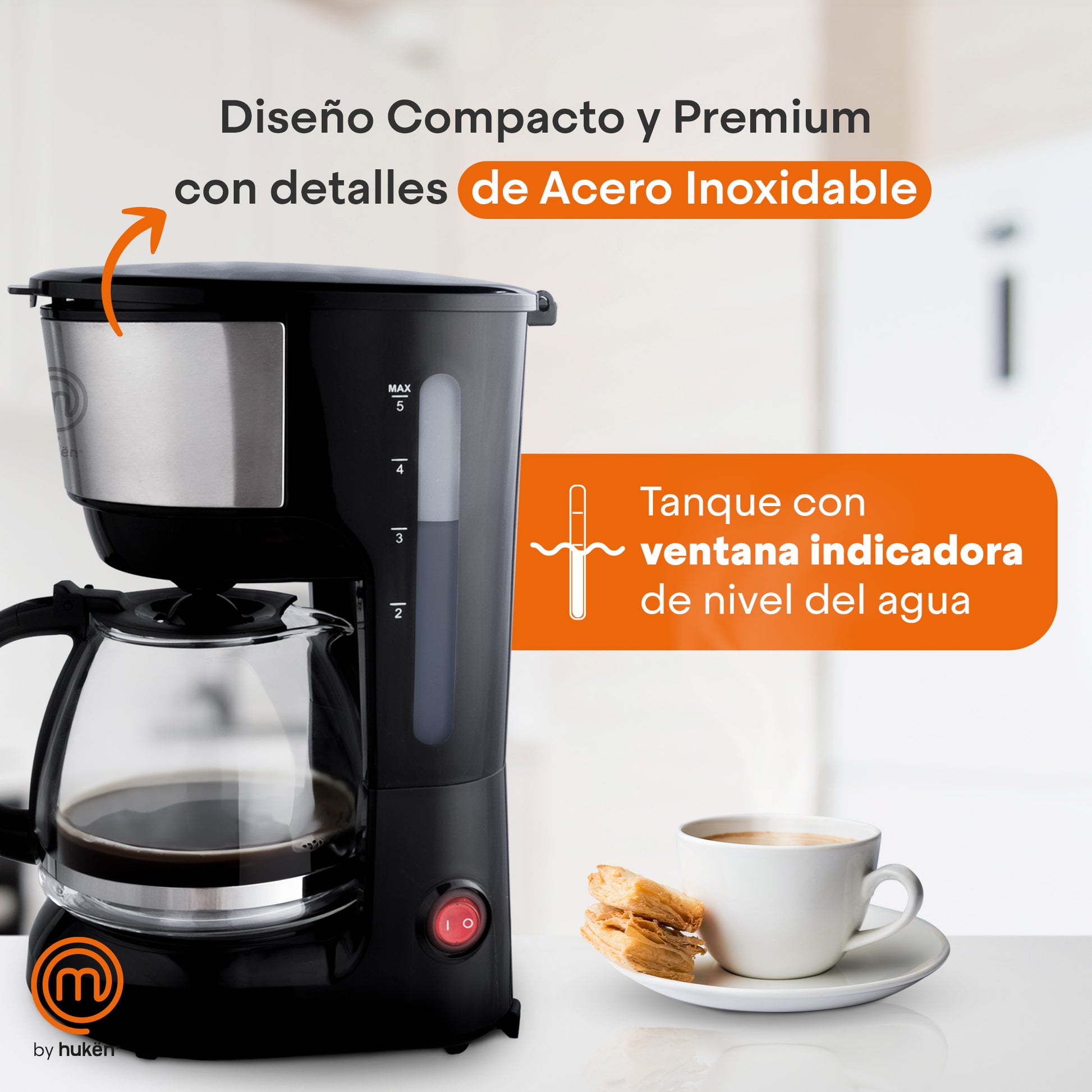 Cafetera Easy-Brew 5 Tazas | Filtro Permanente | Botón con Luz Indicadora | Jarra de Vidrio Borosilicato | Pausa para Servir | Compacta e Inoxidable | Hukën x MasterChef