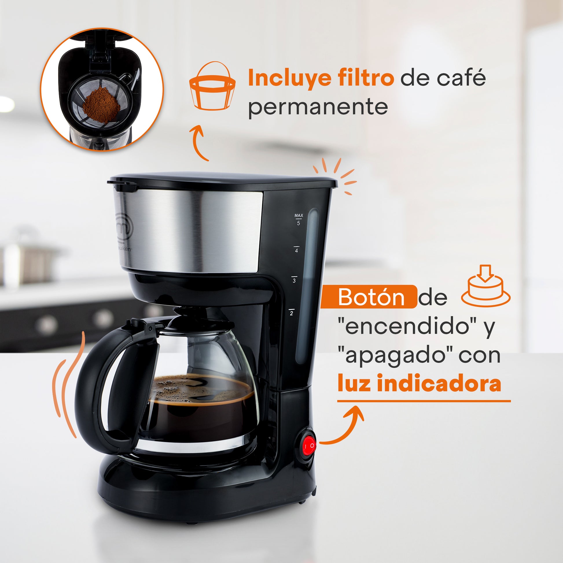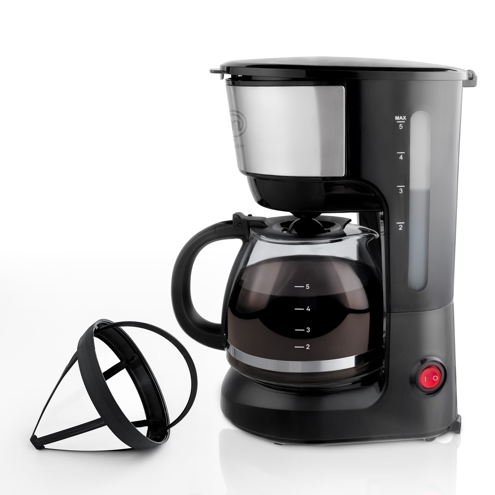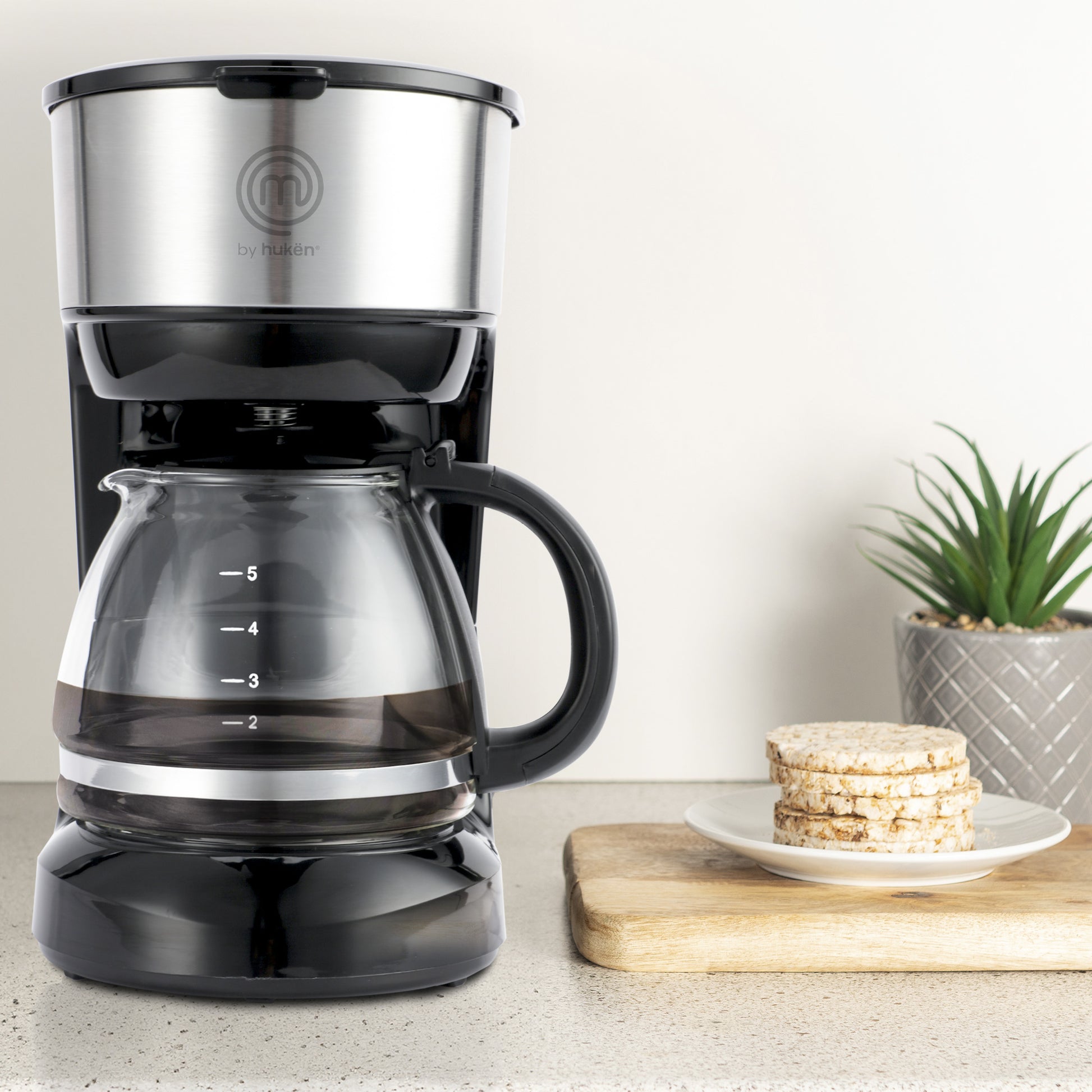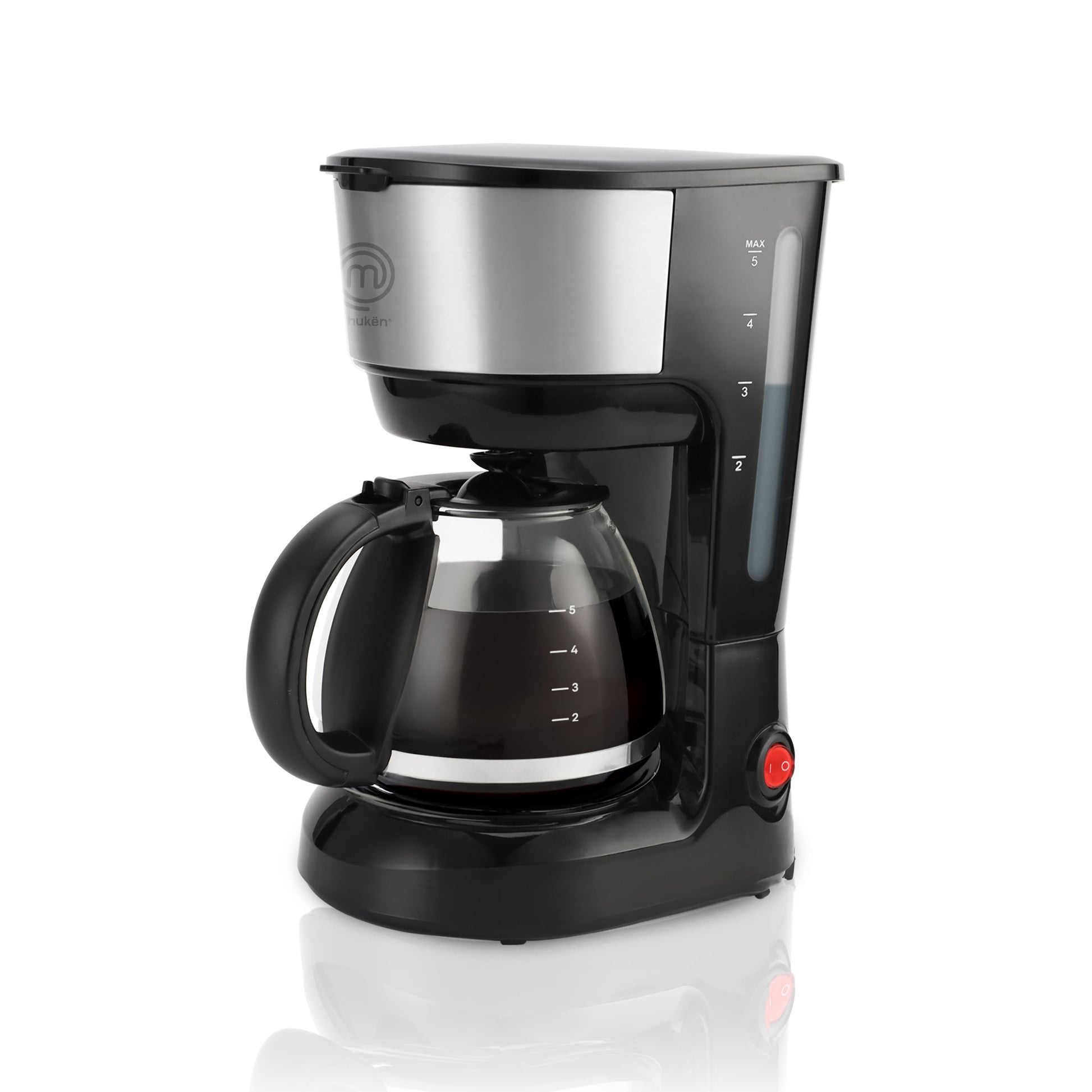 Cafetera Easy-Brew 5 Tazas | Filtro Permanente | Botón con Luz Indicadora | Jarra de Vidrio Borosilicato | Pausa para Servir | Compacta e Inoxidable | Hukën x MasterChef