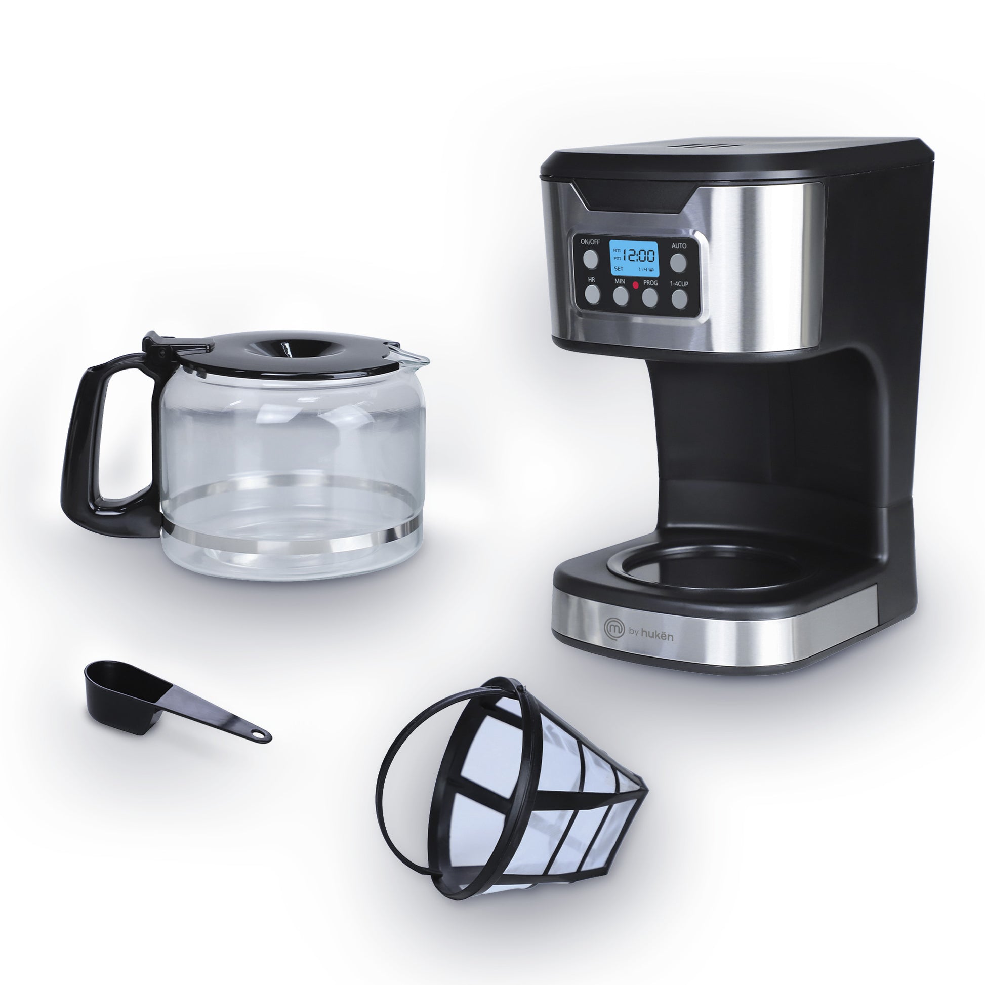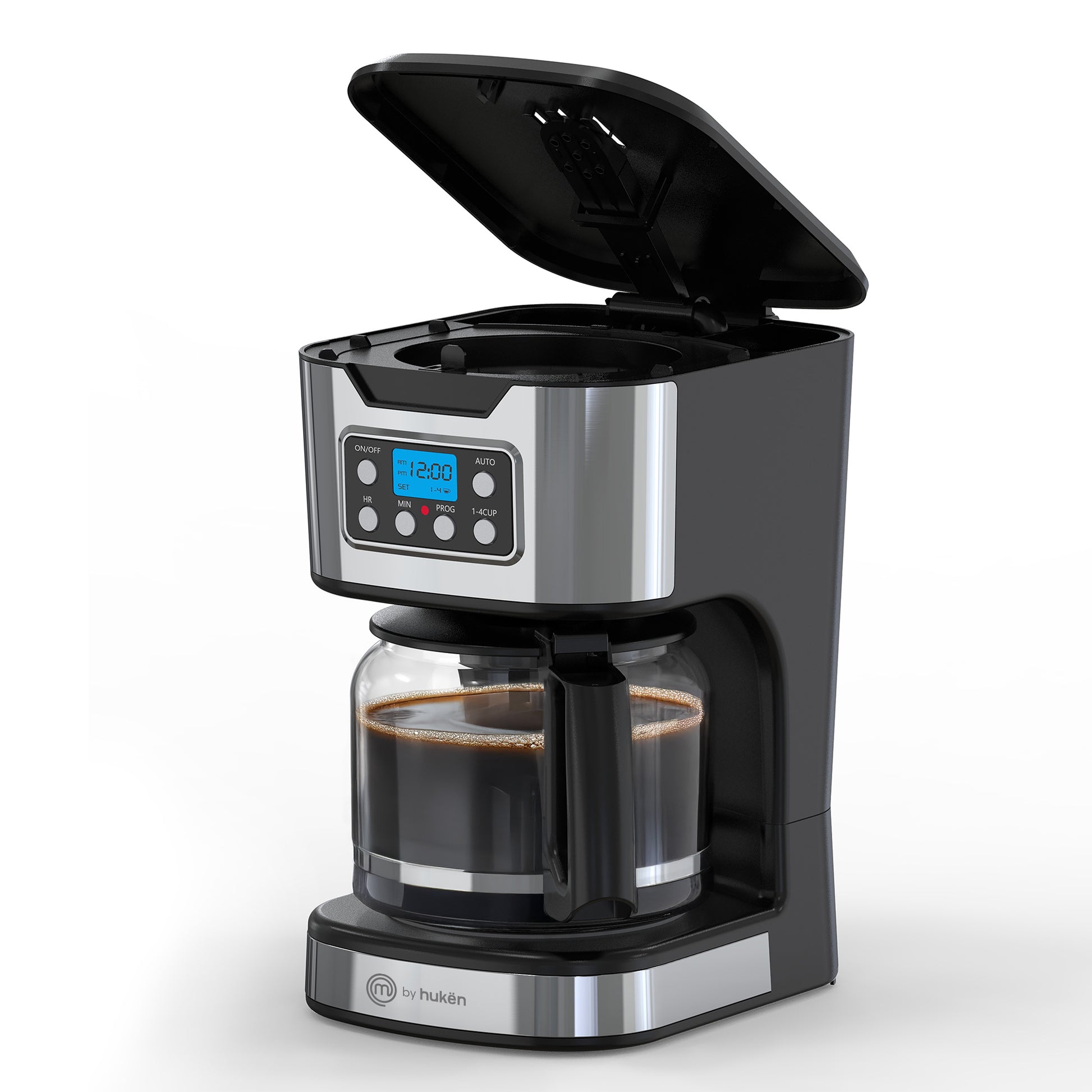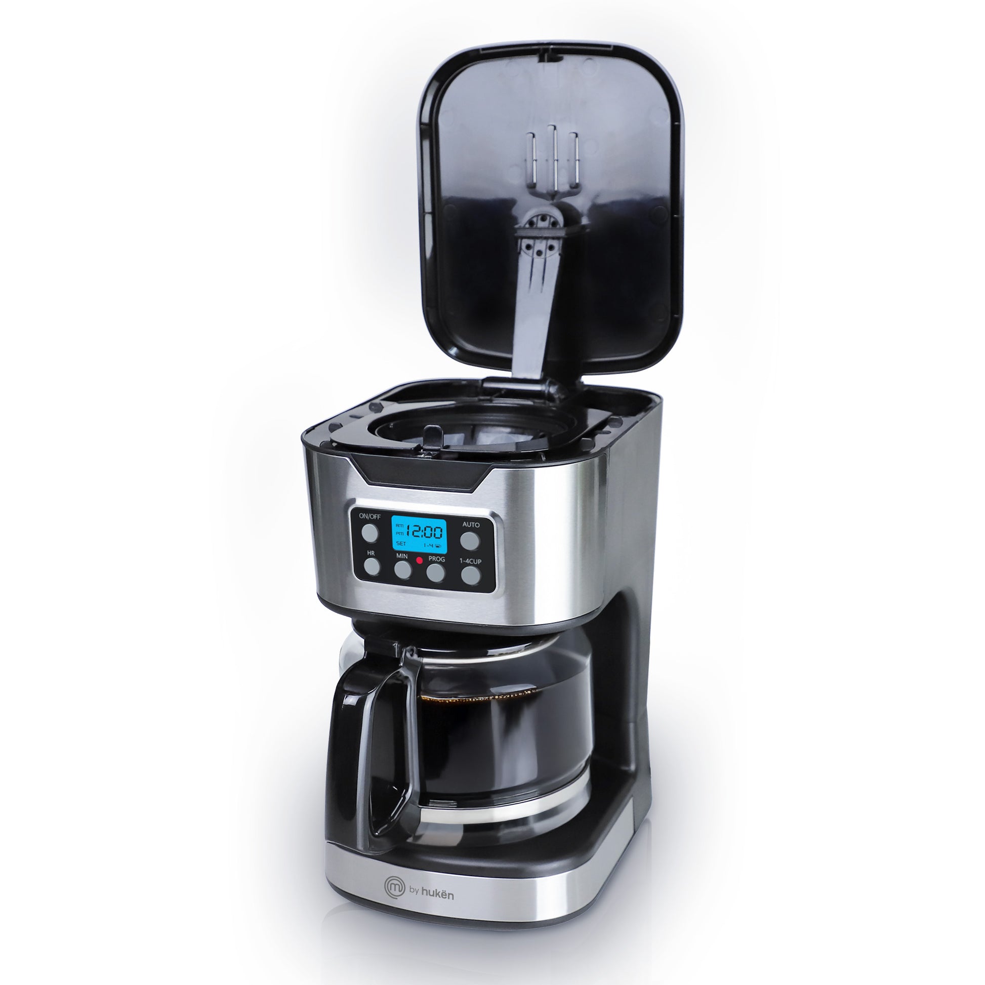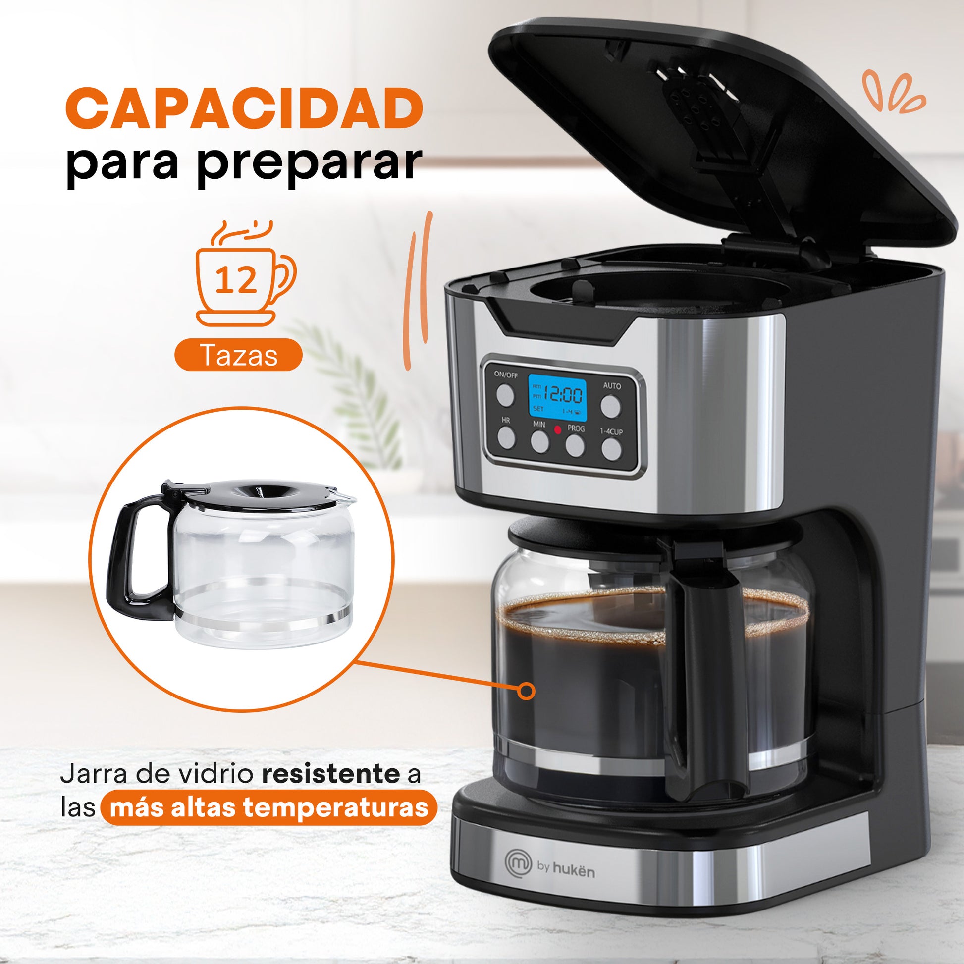 Cafetera Programable TASTY-BREW 12 Tazas | Panel Digital con Reloj | Mantiene Caliente | Apagado Automático | Filtro Permanente | Jarra de Vidrio | Acero Inoxidable | Hukën x MasterChef