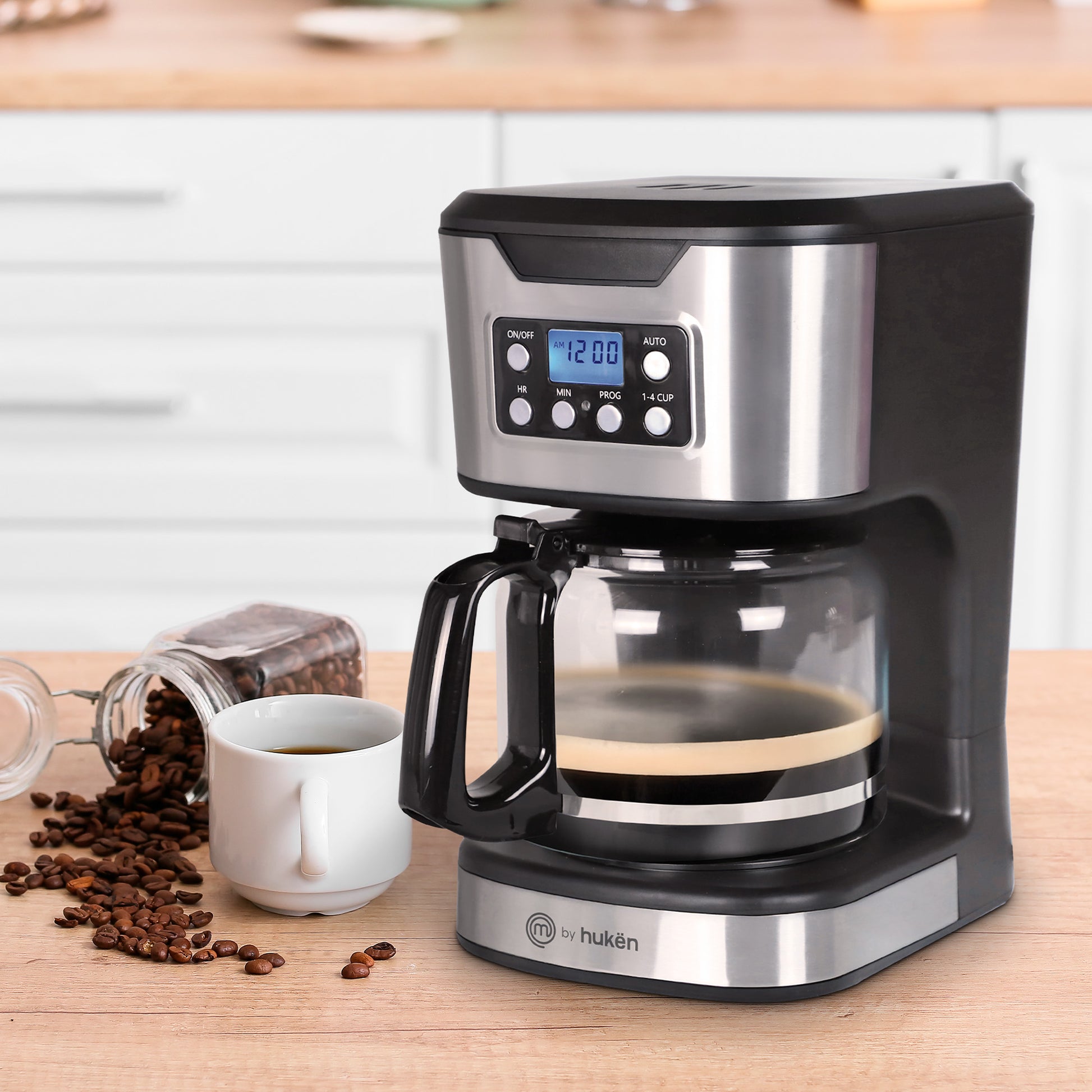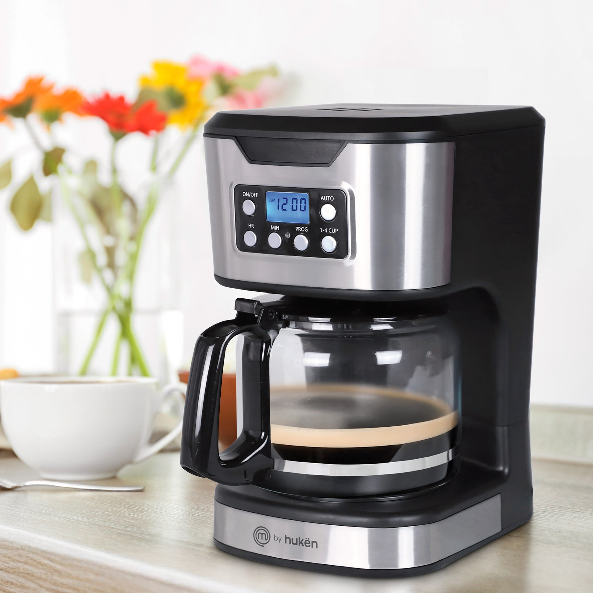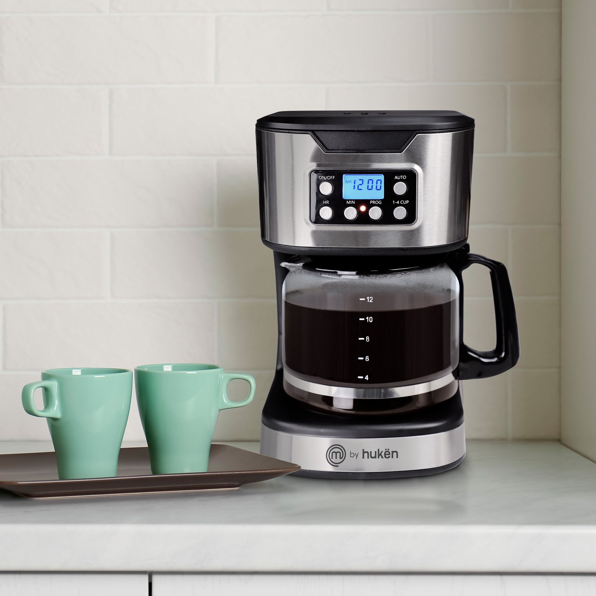 Cafetera Programable TASTY-BREW 12 Tazas | Panel Digital con Reloj | Mantiene Caliente | Apagado Automático | Filtro Permanente | Jarra de Vidrio | Acero Inoxidable | Hukën x MasterChef
