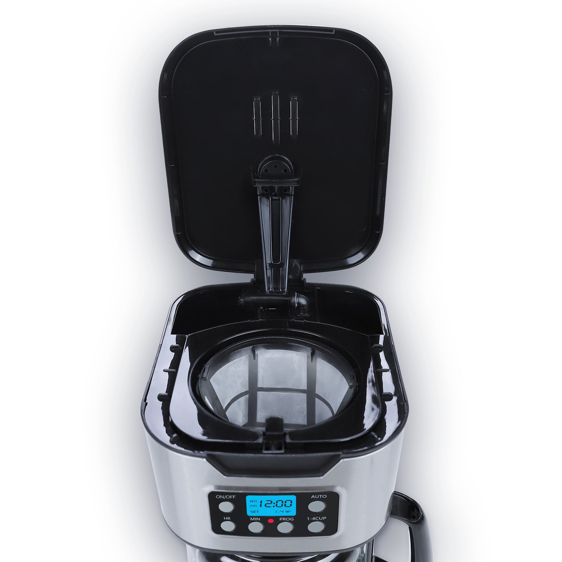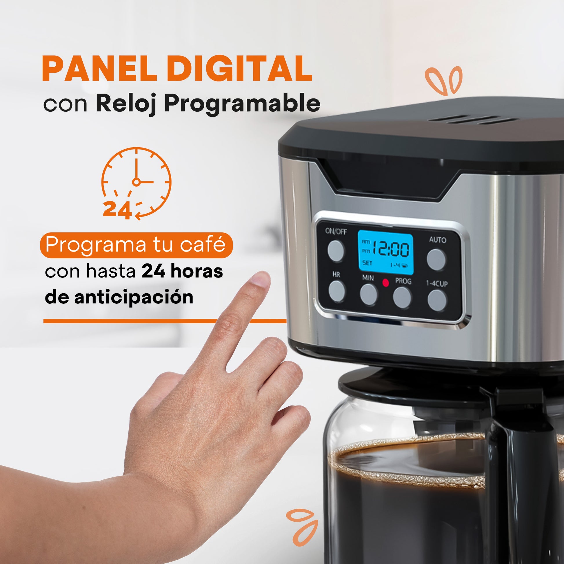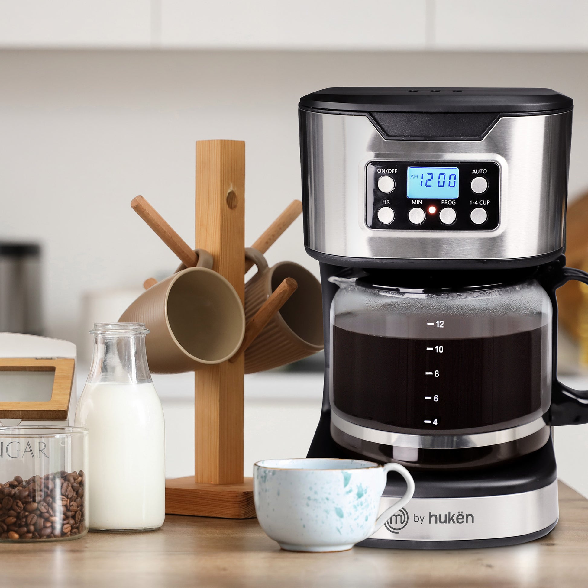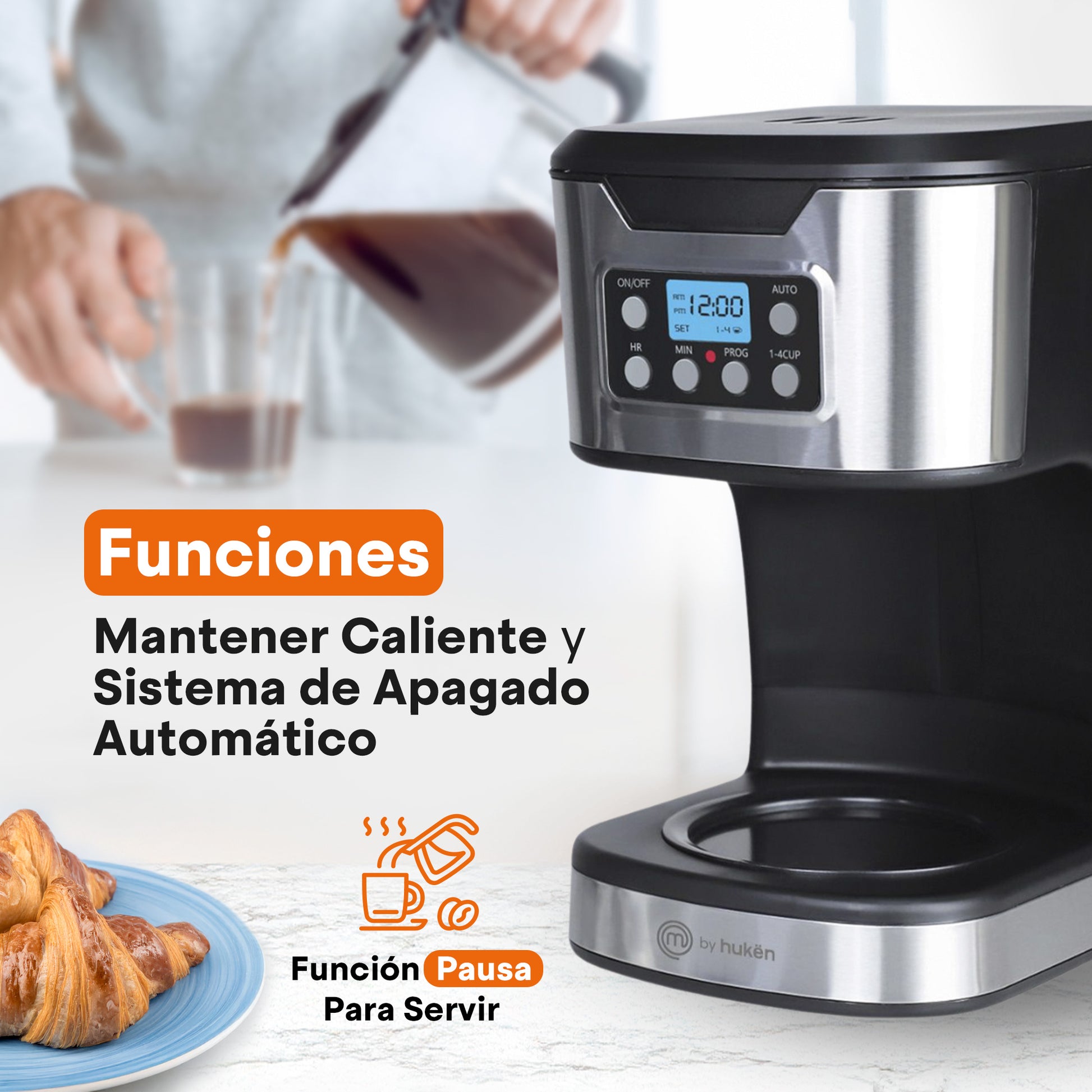 Cafetera Programable TASTY-BREW 12 Tazas | Panel Digital con Reloj | Mantiene Caliente | Apagado Automático | Filtro Permanente | Jarra de Vidrio | Acero Inoxidable | Hukën x MasterChef