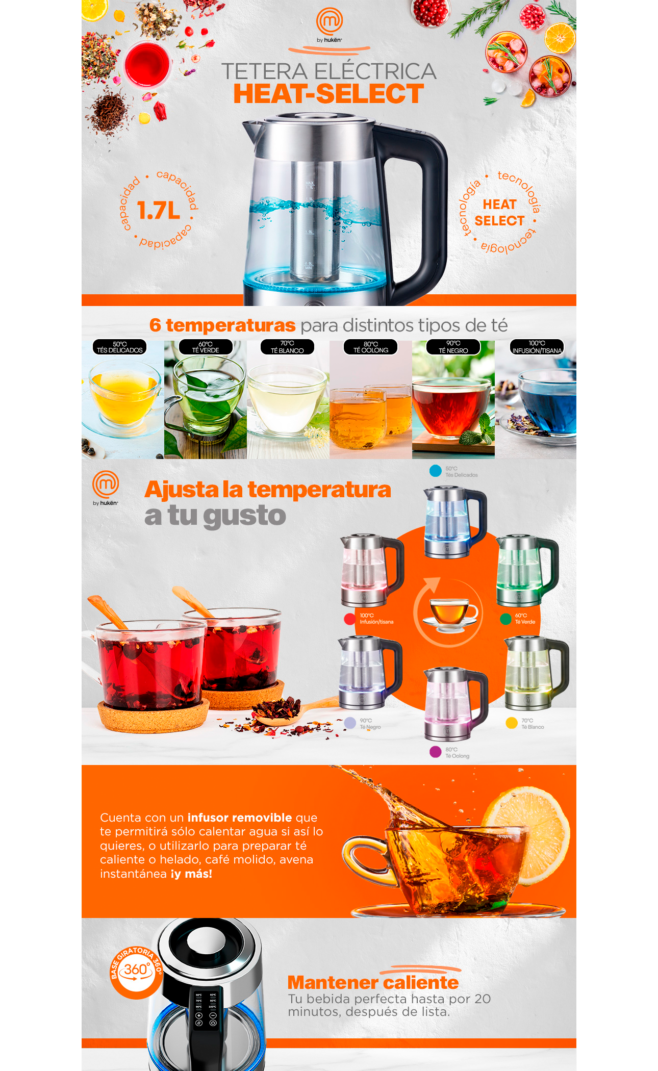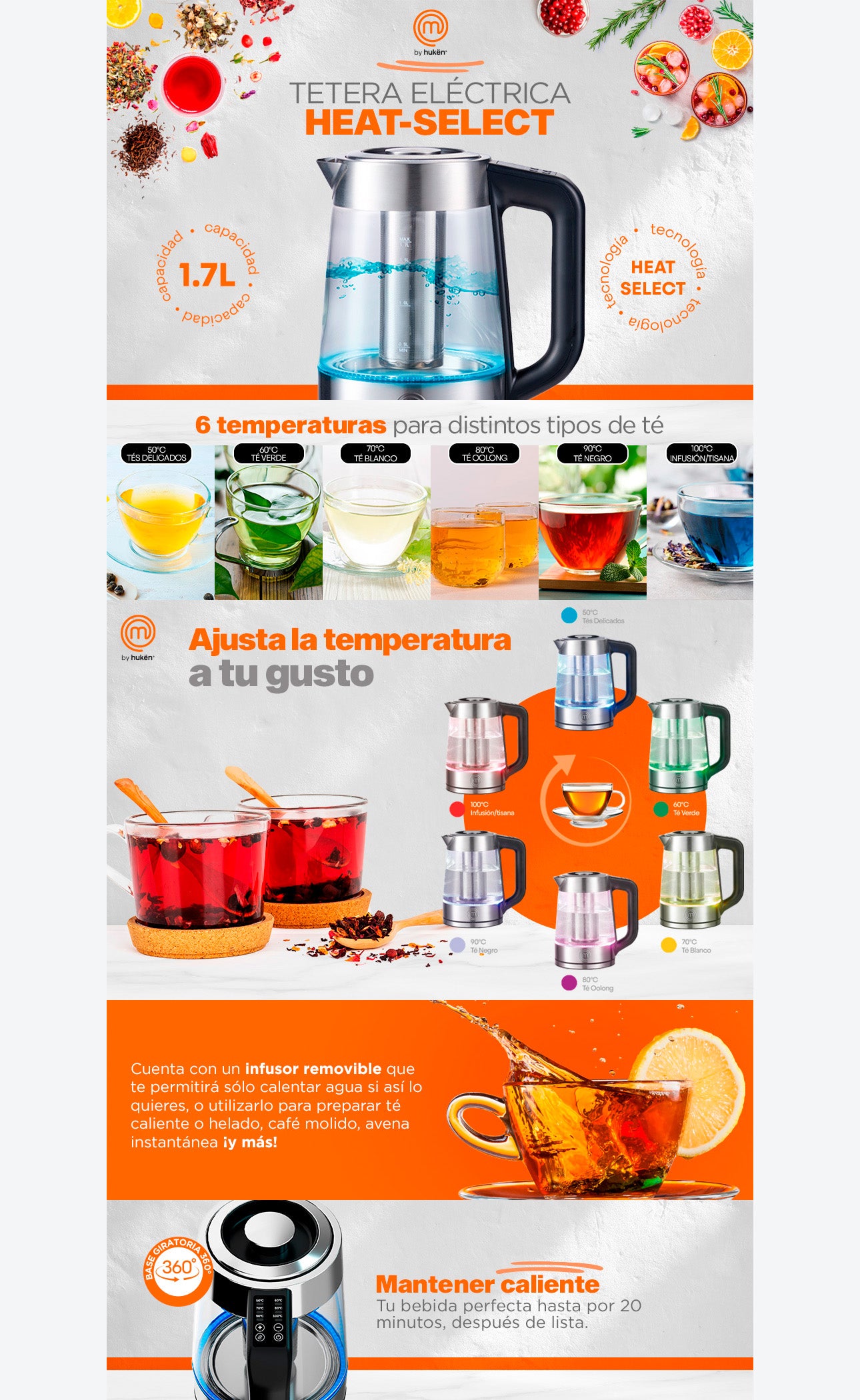 Olvídate de la estufa, la Tetera Eléctrica HEAT-SELECT de Hukën x MasterChef te permitirá hacer increíbles infusiones (su infusor es removible) o calentar agua en segundos. Segura y sencilla de usar, cuenta con una jarra de borosilicato resistente a altas temperaturas y un diseño ergonómico con panel de control en el asa para seleccionar 5 distintos niveles de temperatura, apagado automático cuando el agua llega al hervor, y luces LED que te indican a qué temperatura está funcionando. Su base giratoria de 360º la hace adaptable para diestros y zurdos, y con sus acabados de acero inoxidable, lucirá increíble en cualquier cocina.
