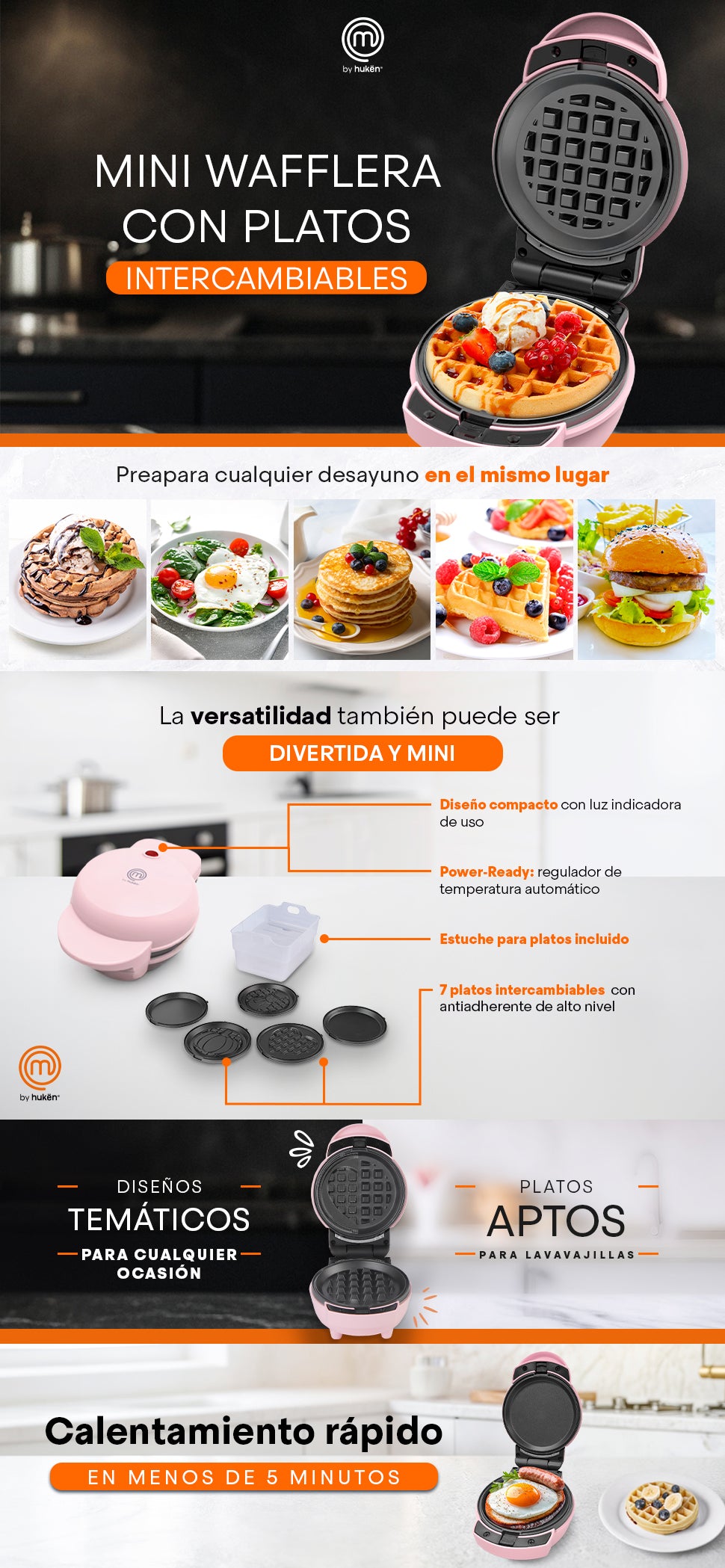 Prepara desayunos irresistibles con la Mini Wafflera Multi-Maker de MasterChef by Hukën, diseñada para que disfrutes de la máxima versatilidad en la cocina. Incluye 7 mini platos intercambiables con recubrimiento antiadherente, perfectos para hacer waffles belgas, hot cakes, quesadillas, huevos y más con facilidad.