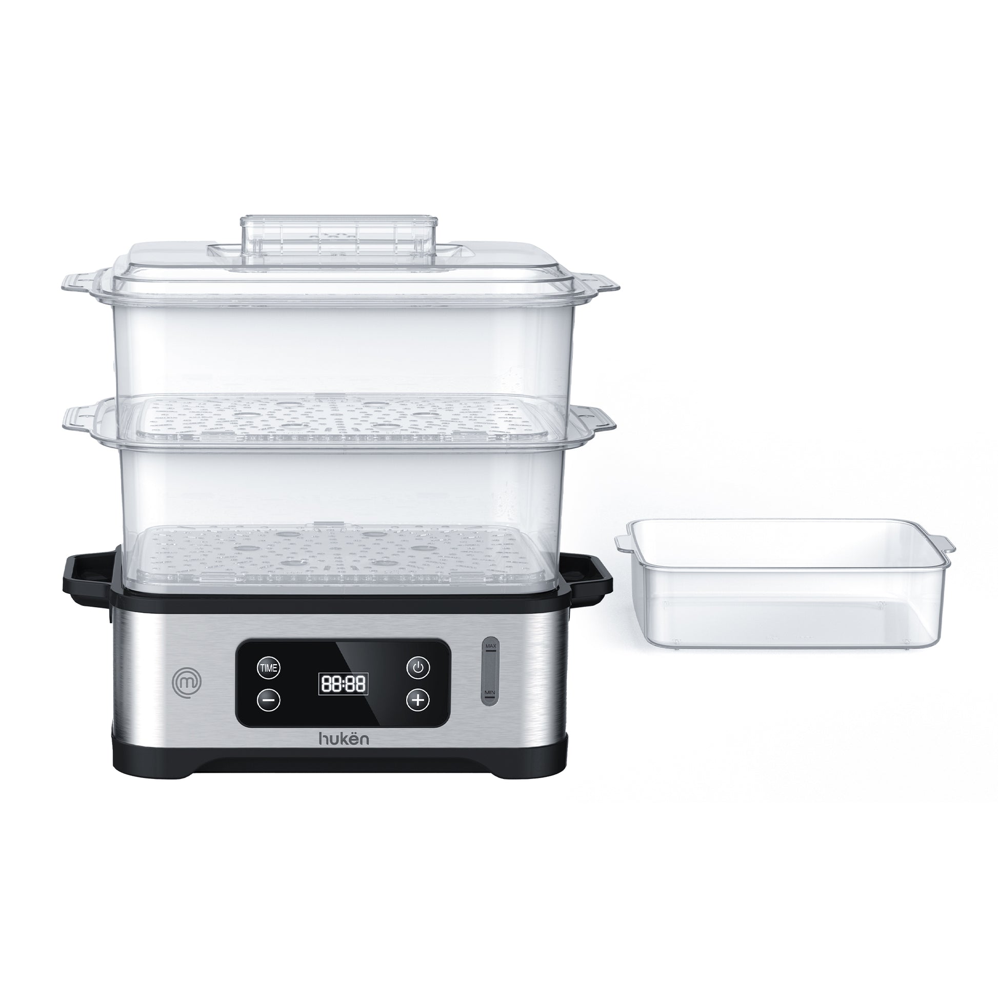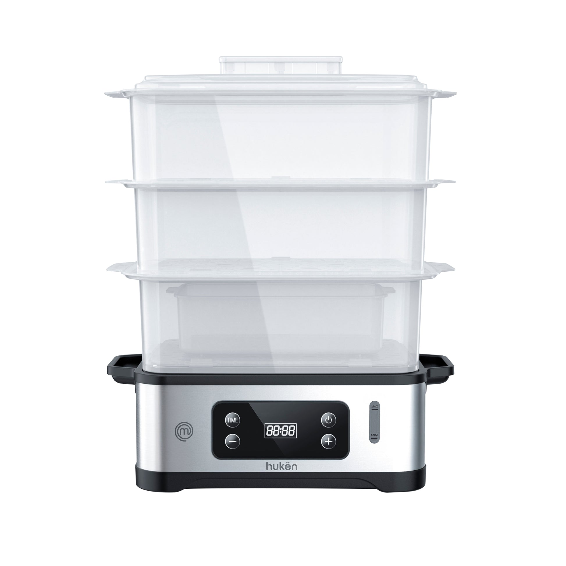 Vaporera POWER-STEAM 360 | 12L con 3 Niveles | Panel Digital con Temporizador | Cocción 360° | Recarga de Agua Lateral | Base de Acero Inoxidable | Libre de BPA | Hukën x MasterChef